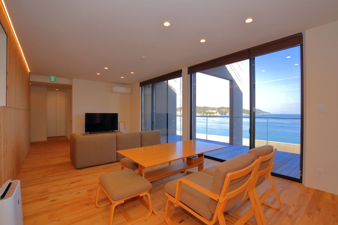 目の前に海が広がる、最高のロケーション。1階と2階にあるベッドルームのほか、広いリビングや海を見渡せるベランダも貸切で利用できる贅沢さが魅力です